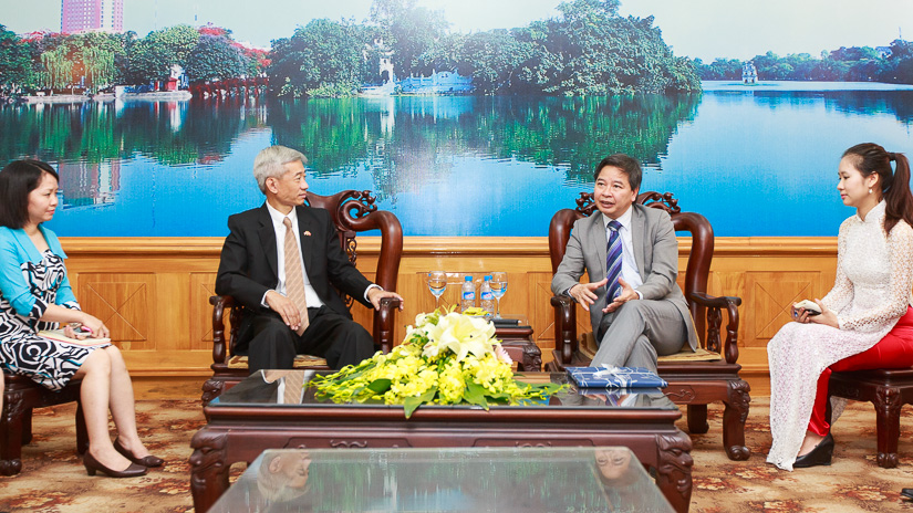 Ngài Panyarak Poolthup mới sang Việt Nam để bắt đầu nhiệm kỳ Đại sứ của mình. Ông bày tỏ mong muốn tìm hiểu thêm thông tin về Trường ĐHKHXH&NV, ĐHQGHN và cam kết ủng hộ và thúc đẩy mạnh mẽ các hoạt động hợp tác giữa các ĐH Thái Lan với Nhà trường. PGS.TS Phạm Quang Minh chia sẻ một số thông tin về tình hình nghiên cứu và đào tạo ngành Thái Lan học tại Trường.