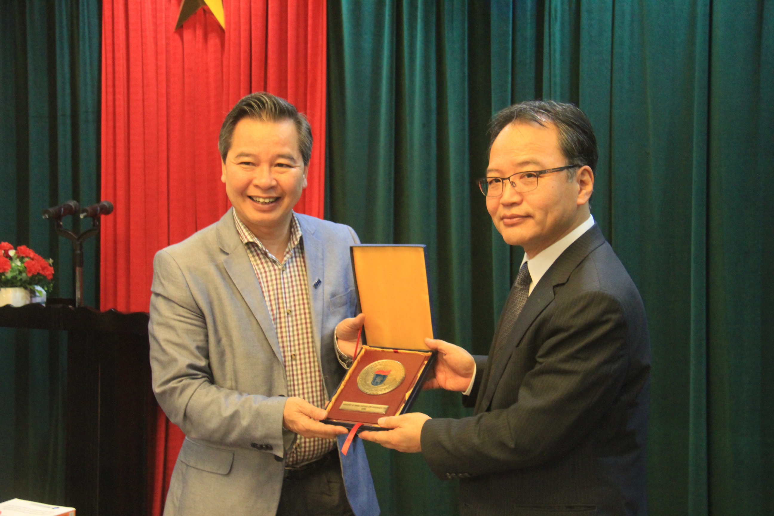 GS. TS Phạm Quang Minh trao đổi quà và chụp ảnh lưu niệm với đoàn công tác Đại học Saga