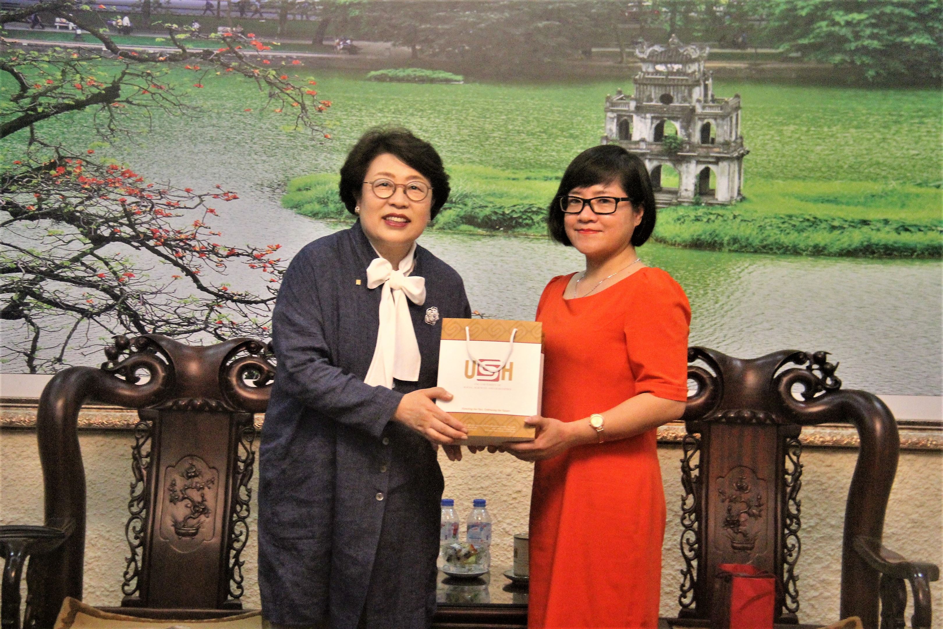 Tại buổi làm việc, TS. Kim Chonghee đã giới thiệu đôi nét về Đại học Sangmyung – một trong những trường đại học được xếp thứ hạng cao tại Hàn Quốc. Bà bày tỏ mong muốn tăng cường giao lưu văn hóa; mở các chương trình đào tạo liên thông, trao đổi sinh viên, học giả giữa hai trường, đặc biệt là giữa các ngành Phúc lợi gia đình, Giáo dục tiếng Hàn của Đại học Sangmyung và ngành Xã hội học, Công tác xã hội của Trường ĐHKHXH&NV. Đồng thời, bà cũng đề xuất hai bên cùng triển khai chương trình đào tạo thạc sỹ “1+1” cho ngành Hàn Quốc học.