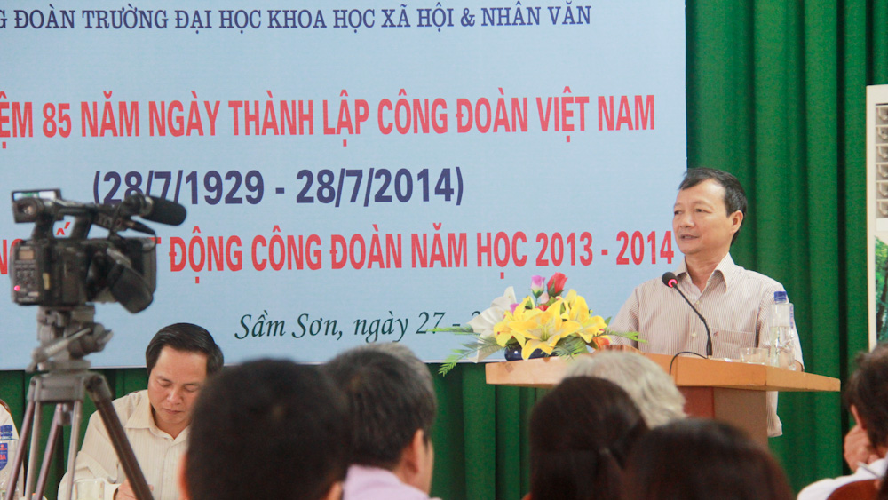 PGS.TS Đặng Xuân Kháng, Chủ tịch Công đoàn Nhà trường trình bày bản tổng kết hoạt động công đoàn năm học 2013-2014, phương hướng nhiệm vụ trọng tâm năm học 2014-2015