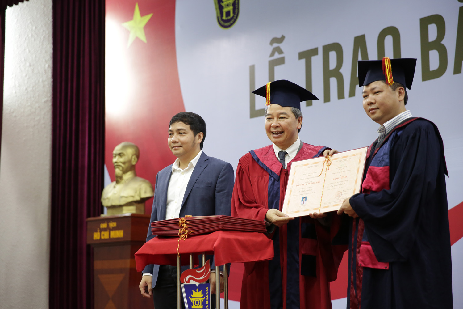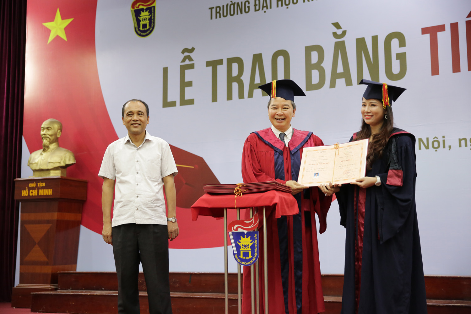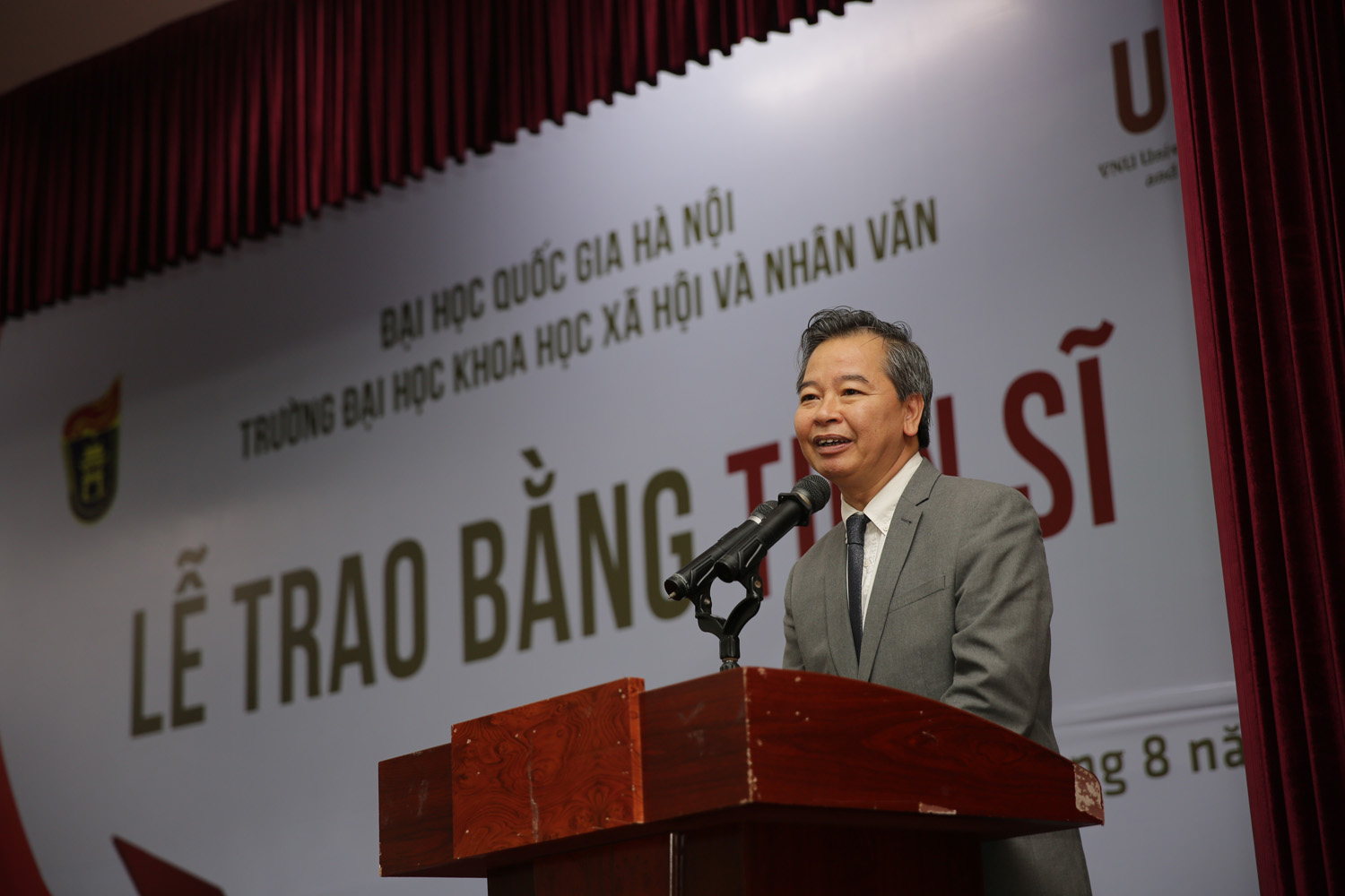 Phát biểu chúc mừng các tân tiến sĩ, GS.TS Phạm Quang Minh (Hiệu trưởng Trường ĐHKHXH&NV) cho rằng đây là thành quả xứng đáng sau biết bao nỗ lực và vất vả của các NCS. Chính đam mê với công việc nghiên cứu đã giúp NCS vượt qua những khó khăn trong học tập và cuộc sống để đạt đến thành công hôm nay. Nhưng tấm bằng Tiến sĩ chỉ là khởi đầu cho chặng đường nghiên cứu dài sắp tới, rất cần sự chủ động, sáng tạo và tự hoàn thiện hơn nữa của mỗi người. GS Hiệu trưởng mong rằng sẽ gặp lại các tân Tiến sĩ với vai trò là những chuyên gia nghiên cứu hàng đầu trên các lĩnh vực khoa học trong tương lai, góp phần đưa nền khoa học Việt Nam hội nhập với thế giới. Thành công của các tân Tiến sĩ góp phần tạo nên uy tín học thuật của Nhà trường, giúp lan toả thương hiệu của Nhà trường trong xã hội.
