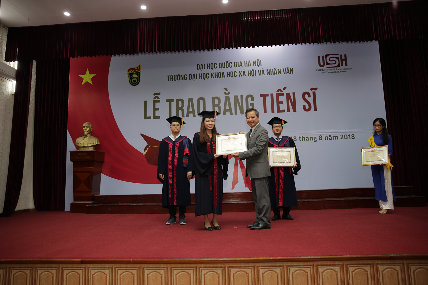 GS. Phạm Quang Minh trao phần thưởng cho 04 NCS có thành tích học tập xuất sắc: Lê Trung Kiên (Hồ Chí Minh học), Nguyễn Thị Thuỳ Trang (Quan hệ quốc tế), Trần Đăng Trung (Lí luận văn học), Phạm Ngọc Hường (Hán Nôm).