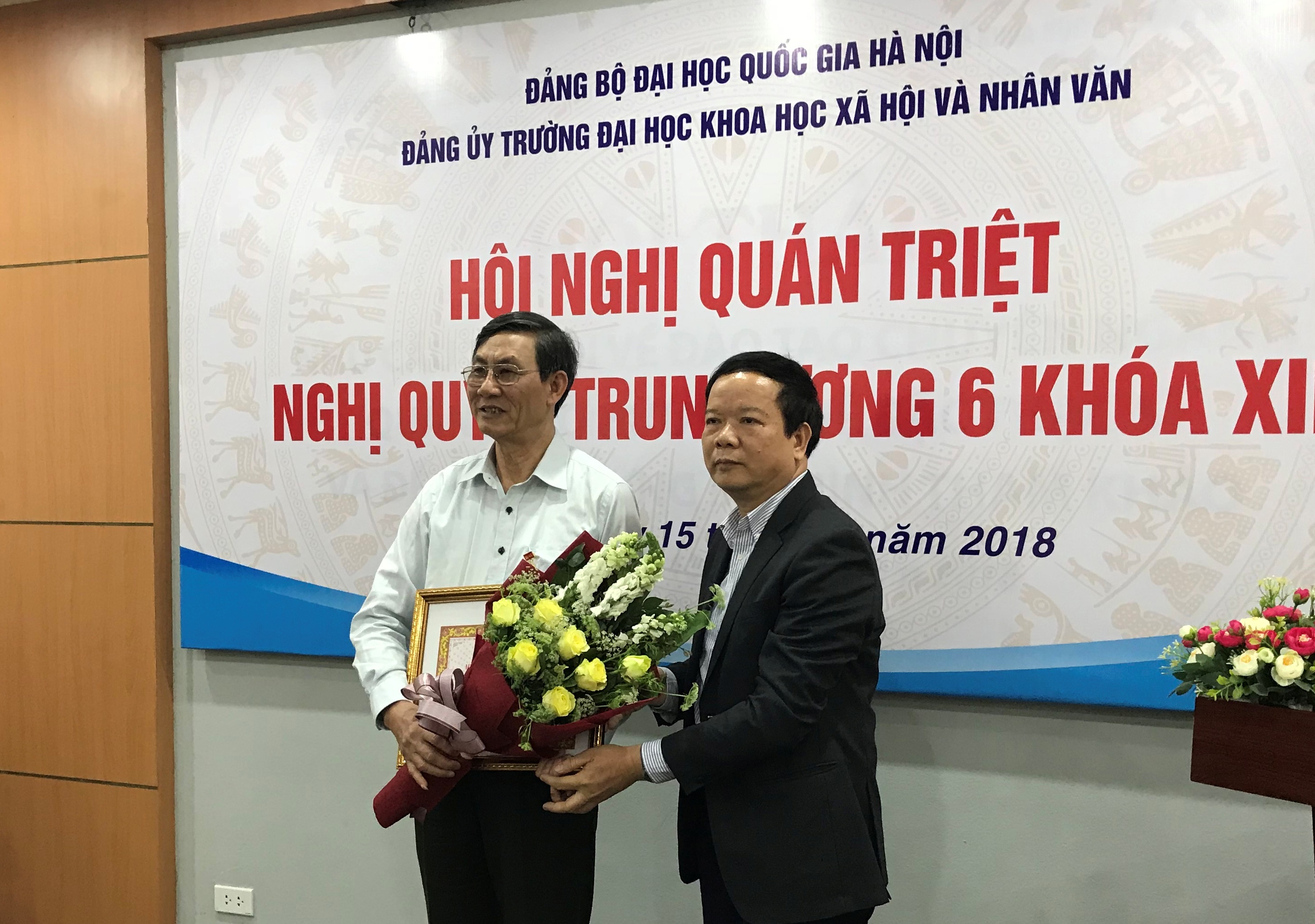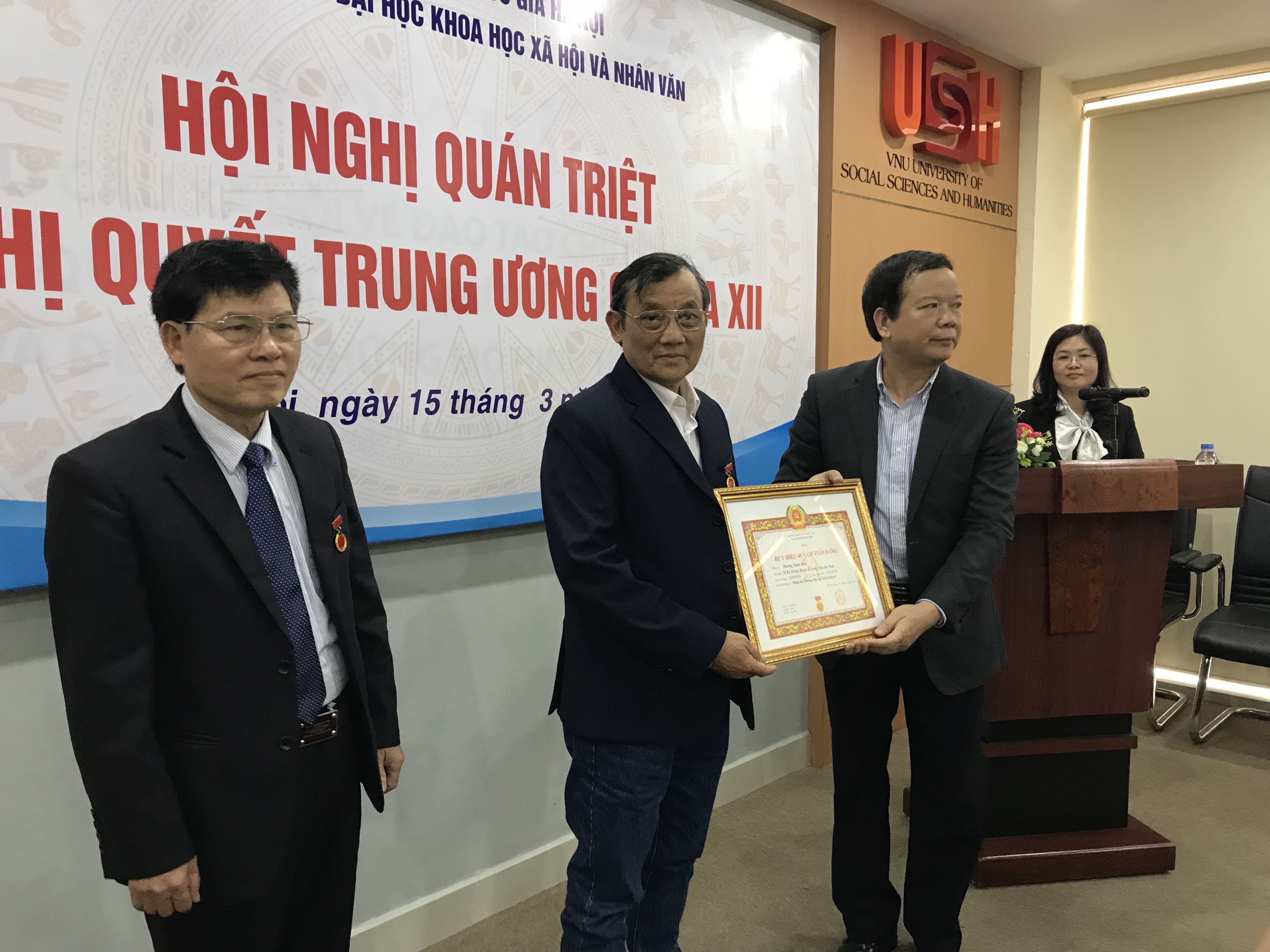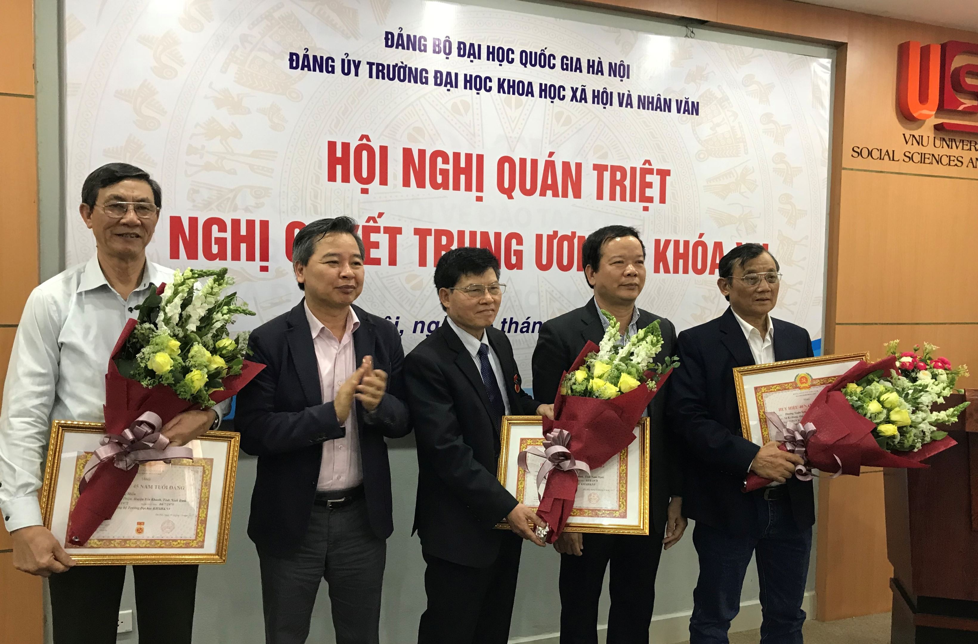 Đồng chí Ngô Thị Kiều Oanh (Uỷ viên Ban Thường vụ Đảng uỷ, Trưởng ban kiểm tra Đảng uỷ Trường ĐHKHXH&NV) đã công bố các quyết định của Ban Thường vụ Thành uỷ Hà Nội về việc trao tặng Huy hiệu Đảng năm 2017 cho các đảng viên thuộc Đảng bộ ĐHQGHN, trong đó có 04 đảng viên thuộc Đảng bộ Trường ĐHKHXH&NV.
